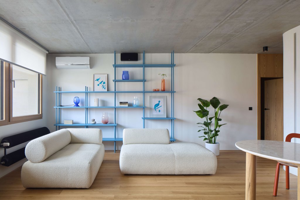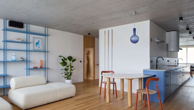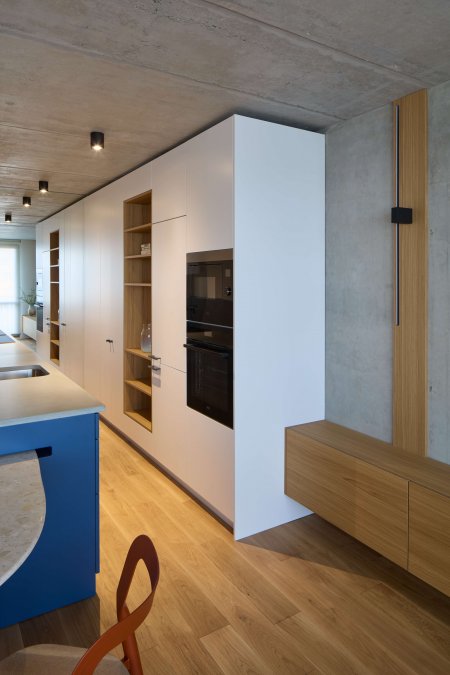 Sledujeme zámer vytvoriť elegantnú atmosféru so zaujímavými kontrastnými detailmi, ktoré pôsobia energicky a zároveň upokojujúcim dojmom. Betón, ktorý k panelovému domu patrí, neskrývame. Plochy sme očistili od nánosov malieb a omietok a pomocou retuší ich premenili na pôsobivé plochy surového betónu. Drevená dosková podlaha je našou palubou, na ktorej sa odohráva život. Modrá v rôznych odtieňoch, ktoré nadväzujú, ale nie sú rovnaké, je použitá na kuchyni, knižnici či svietidlách a vytvára dojem mora okolo nás. Hlinená stierka v spálni predstavuje dno alebo pláž, ku ktorej priplávame.
