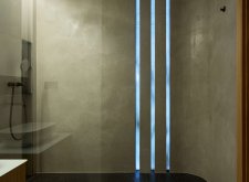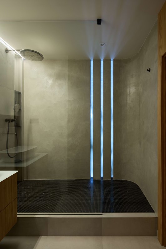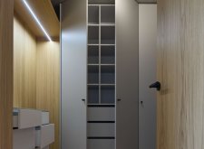 Dispozíciu pôvodného 3+kk sme zmenili na veľkorysé 2+kk so samostatnou šatňou. V kúpeľni sme vytvorili priestranný sprchovací kút a priestor okolo závesnej toalety doplnili úložnými prvkami. Šatňa poskytuje samostatný úložný priestor vrátane niky na cyklistické kolo s možnosťou nabíjania, rovnako ako miesto na nabíjanie elektrického vysávača.