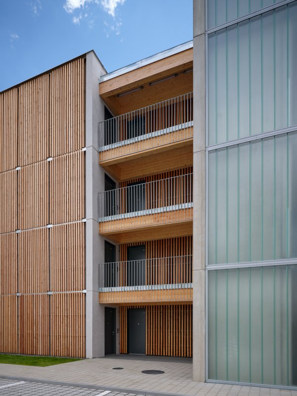 Udržateľnosť je vyjadrená kompaktnosťou hmoty a jednoduchou modulárnou prefabrikovanou konštrukciou z dreva a betónu. Stavba využíva pasívne energetické prvky - tienenie fasádnymi okenicami, prirodzené vetranie všetkých bytov juh/sever. Na streche av átriách je použitá vegetácia na zlepšenie vnútorného aj vonkajšieho prostredia. Prírode blízke sú navrhnuté vonkajšie úpravy so zeleňou a priepustnými povrchmi.