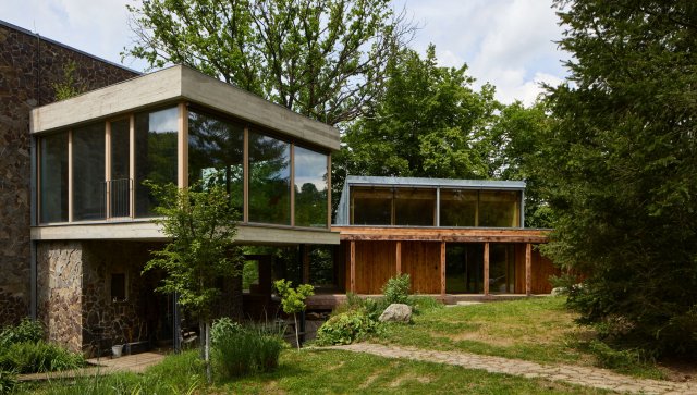 Pri hľadaní vhodného miesta a objemu sme rešpektovali klinovitý tvar pozemku, konfiguráciu terénu, existujúce vyrastené stromy a ukázalo sa, že je dôležité, aby bol zachovaný výhľad zo záhrady domu do údolia Sázavy a na vrchol Medníku.