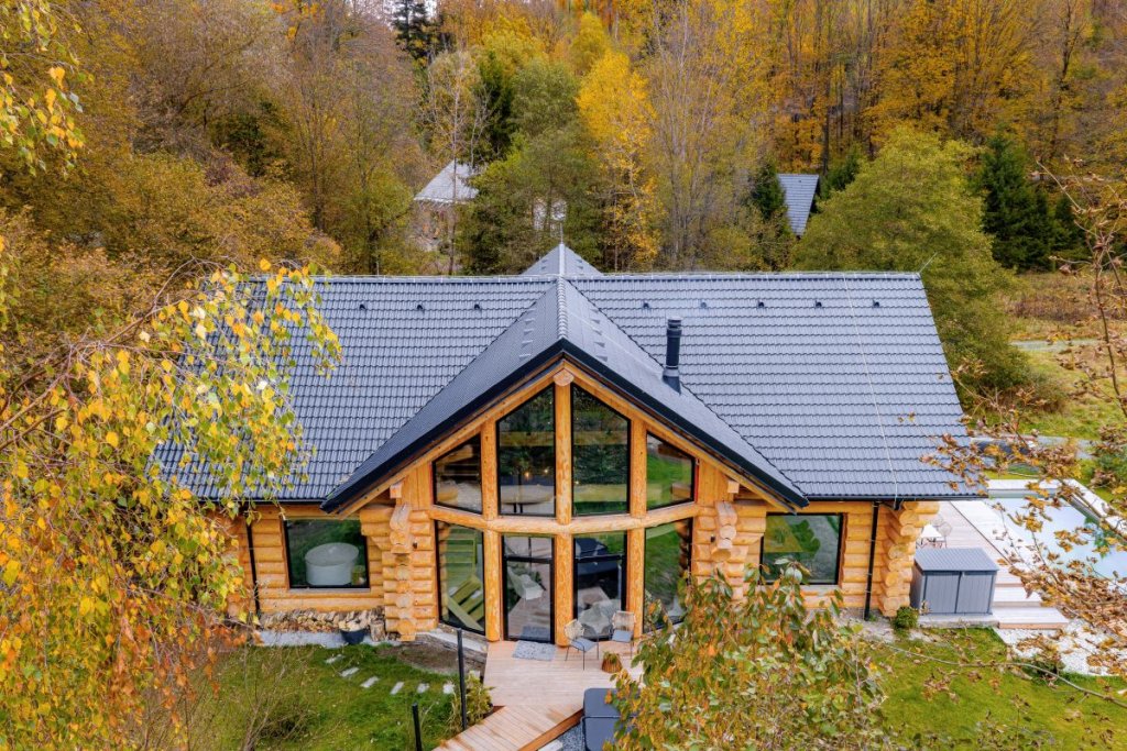 Stavba je založená konzervatívne na betónových pásoch a soklovom murive z tvárnic strateného debnenia s tepelnou izoláciou. „Štandardne boli použité dosky z extrudovaného polystyrénu, ktorý je tvrdý, veľmi dobre izoluje a je nenasiakavý. Dá sa naň následne pridať aj kamenný obklad, ako tomu bolo v tomto prípade,“ opisuje architekt. Samotná zrubová konštrukcia je z beskydskej jedle s priemerom 40 centimetrov. Drevené steny spĺňajú normy pre tepelnoizolačné vlastnosti, takže ich už nebolo potrebné dodatočne zatepľovať. „Jedľu sme zvolili pre krajšiu kresbu dreva. Z vnútornej strany je drevo iba vybrúsené, zostáva mu krása surovosti, zvonku sa guľatina obrúsi a natrie, čo je potrebné približne každých 10 až 12 rokov zopakovať,“ uvádza majiteľka a dodáva: „Celý zrub bol najskôr postavený v mieste jeho výroby, potom rozobraný, naložený a znovu postavený na pripravených základoch domu.“ Montáž strechy zabezpečilo Klempířství Roman Divina. Ako strešná krytina bola zvolená pálená škridla Bramac.