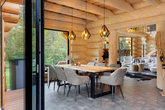 Dom má tvar obdĺžnika a interiér zrubu je navrhnutý ako prízemný so vstavaným podkrovím a veľkolepou presklenou galériou. Na prízemí sa nachádza priestranná kuchyňa s jedálenským kútom. Kuchynskú linku v antracitovej farbe, ktorá je plne vybavená modernými spotrebičmi, dopĺňa jedálenský stôl, pri ktorom si majitelia môžu vychutnať nádherný výhľad na okolitú krajinu. „Do jedálenskej časti, z ktorej je prístup na jednu z terás priliehajúcich k domu, zvolila majiteľka zdvižno-posuvný systém INCON ALUMINIUM PORTAL,“ hovorí architekt. Tento systém ponúka prakticky neobmedzené konštrukčné možnosti a elegantne prepája interiér s exteriérom. Ing. Ladislav Pavlovič, obchodný riaditeľ INCON, dopĺňa: „HS portál tvorí pevné a posuvné krídlo, ktoré sa pohybuje v podlahovej koľajnici rovnobežne popri pevnom krídle. Výstup na terasu je tak úplne bezbariérový, a to vďaka nulovému prahu s rozdielom výšok iba 5 mm.“ Ďalšie okenné prvky zrubu sú zvolené v rovnakom materiálovom aj farebnom prevedení. Majiteľka si vybrala hliníkové okná INCON ALUMINIUM COMFORT s izolačným trojsklom v čiernej farbe RAL 9005. „Hliníkové prevedenie si majiteľka zvolila preto, že ide o prakticky nezničiteľný materiál, ktorý vydrží desaťročia,“ uvádza Ing. Jiří Roubík.