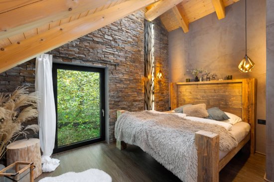 Na prvé poschodie vedie z centrálnej obytnej miestnosti drevené schodisko s preskleným zábradlím a čiernymi stĺpikmi. Sú tu štyri oddelené spálne, ktorých zariadenie a dizajn – rovnako ako zvyšok domu – navrhovala majiteľka úplne sama. Vďaka zošikmeným stropom pôsobia veľmi útulne. Všetky spálne majú z veľkých okien krásny výhľad do záhrady priliehajúcej k domu a poskytujú dostatok komfortu a súkromia pre majiteľov aj prípadné návštevy. Pohodlné postele s vysokým čelom dopĺňajú kresielka, komody a príjemné romantické osvetlenie. Bridlicový obklad stien sa v izbách opakuje a nadväzuje na interiér spodnej časti domu. Na rozdiel od prízemia je na prvom poschodí drevená podlahová krytina v tmavšom prírodnom odtieni. Kúpeľňa priliehajúca k izbám je zariadená v príjemných prírodných tónoch, čo ešte umocňuje použitie drevených detailov, ako je drevený obklad za vaňou či použitie masívnych guľatín ako odkladacích plôch. Opäť tu možno nájsť dotyk čiernych akcentov v podobe batérie pri voľne stojacej vani a pri výraznom striebristom umývadle osadenom na masívnej umývadlovej doske. Farebne zladená je aj tmavá veľkoformátová dlažba.