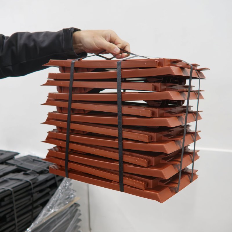 Používame špeciálnu zmes polypropylénu, ktorá umožňuje pridanie recyklátu. Materiál je navyše upravený UV stabilizáciou a antioxidantmi, čo výrazne predlžuje jeho životnosť. Krytina je ľahká, presná a ľahko sa s ňou pracuje.