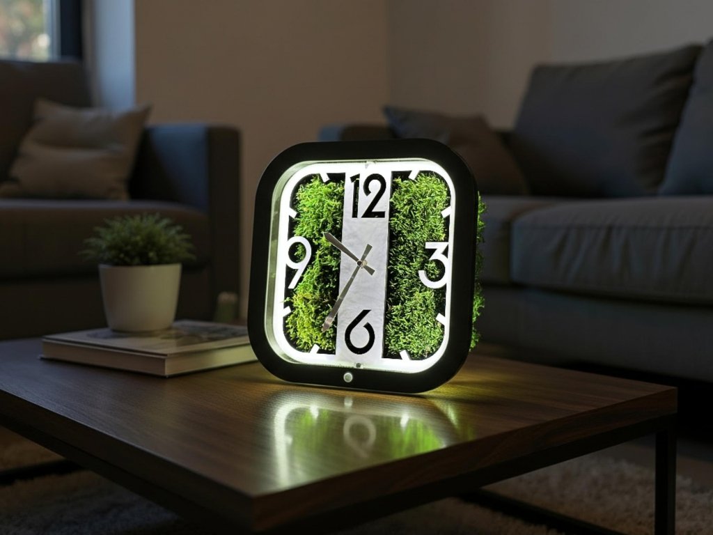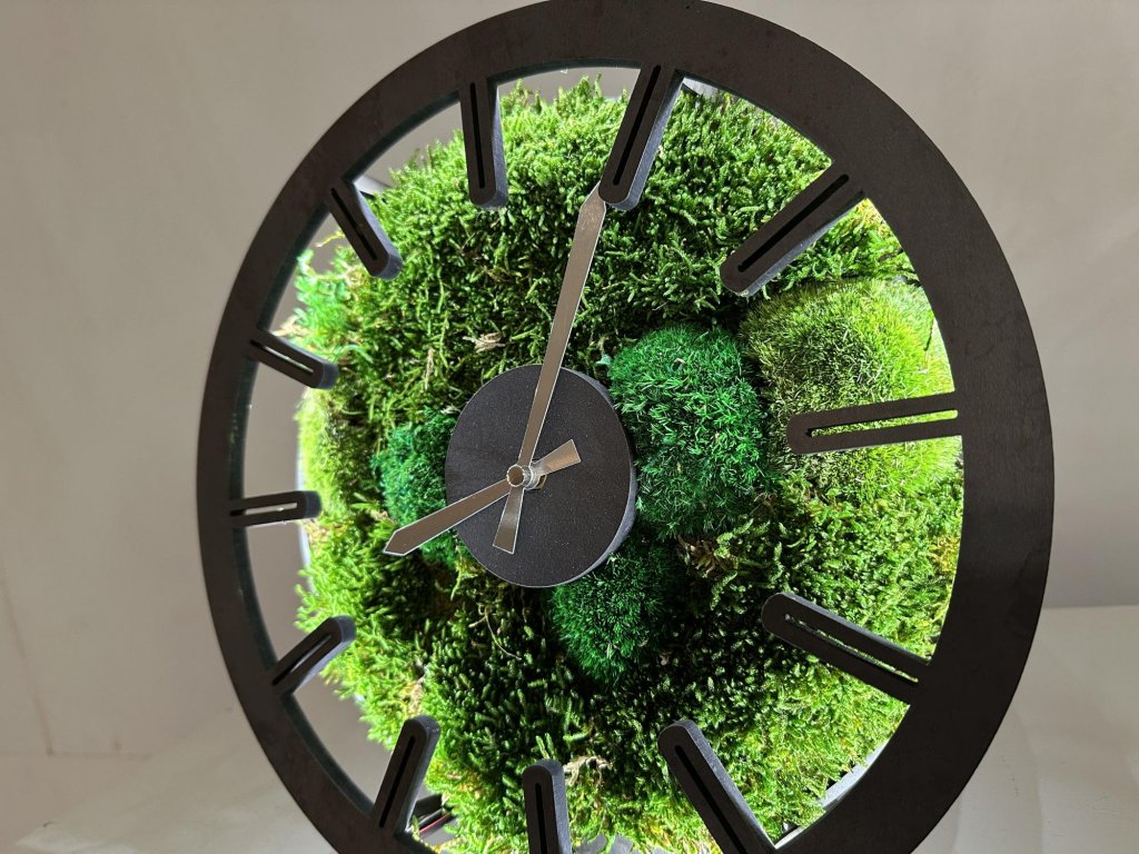 Podsvietené machové hodiny sú unikátnym spojením prírodného materiálu (stabilizovaného machu) a moderného LED osvetlenia, ktoré v interiéri vytvára príjemnú atmosféru a jemné náladové svetlo. Mach v týchto hodinách je bezúdržbový, nepotrebuje polievanie ani slnečné svetlo, a vďaka stabilizácii si zachováva svoju farbu a mäkkosť mnoho rokov. Slúžia nielen ako ukazovateľ času, ale aj ako zdroj jemného náladového osvetlenia, ktoré zvýrazňuje 3D textúru machu.