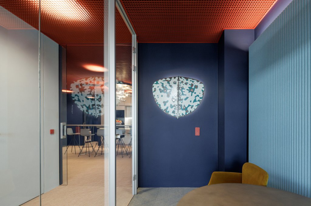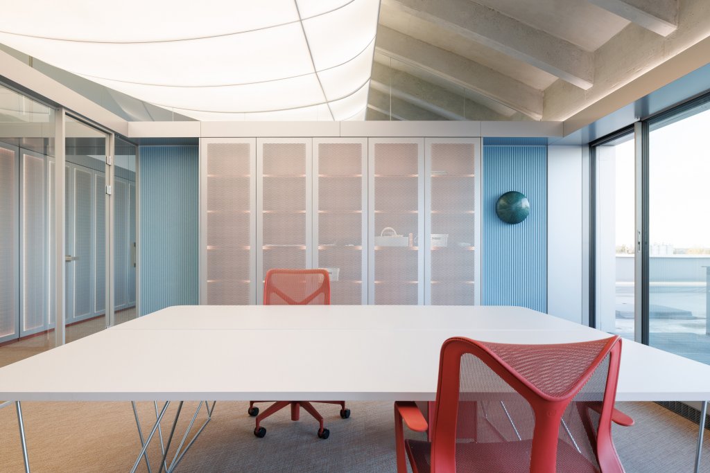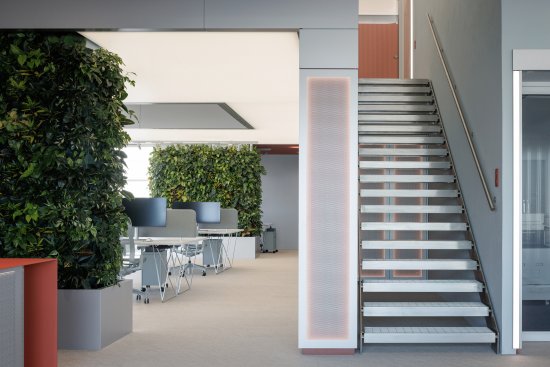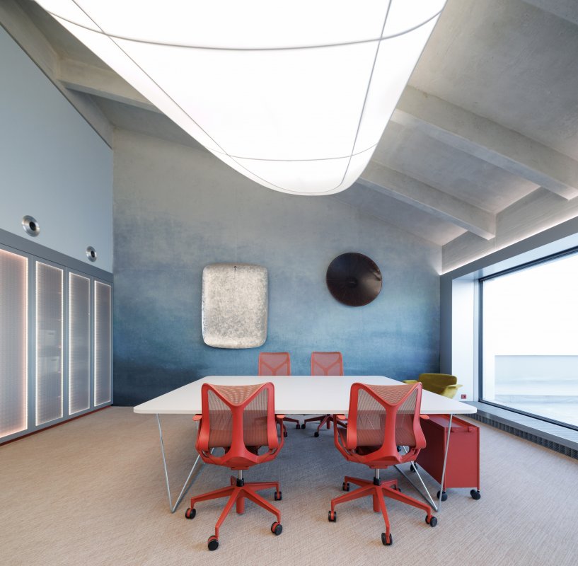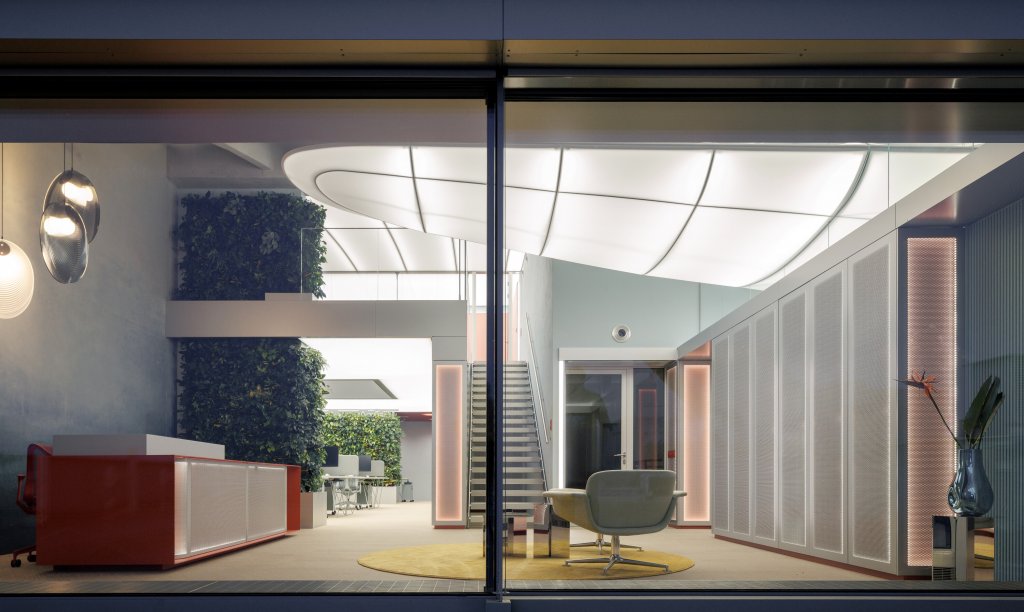 Výzvou projektu bolo dosiahnuť optimálnu akustickú a svetelnú pohodu. Hlavný svetelný prvok – „veľrybie krídlo“ – meria 16 metrov, je z hliníka a komponentov 3D tlače, potiahnutý barrisolovou fóliou s mikroperforovanou spodnou stranou pre lepšiu akustiku a rovnomerný rozptyl svetla. Objekt zároveň optimalizuje prúdenie vzduchu. Open space a rokovacie miestnosti využívajú systém Barrisol Clim – napínanú dvojitú fóliu s integrovaným chladením a ventiláciou, ktorá zaisťuje rovnomerný tepelný komfort a zachováva čistý architektonický výraz.