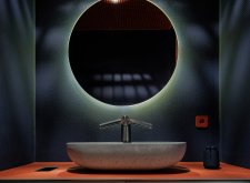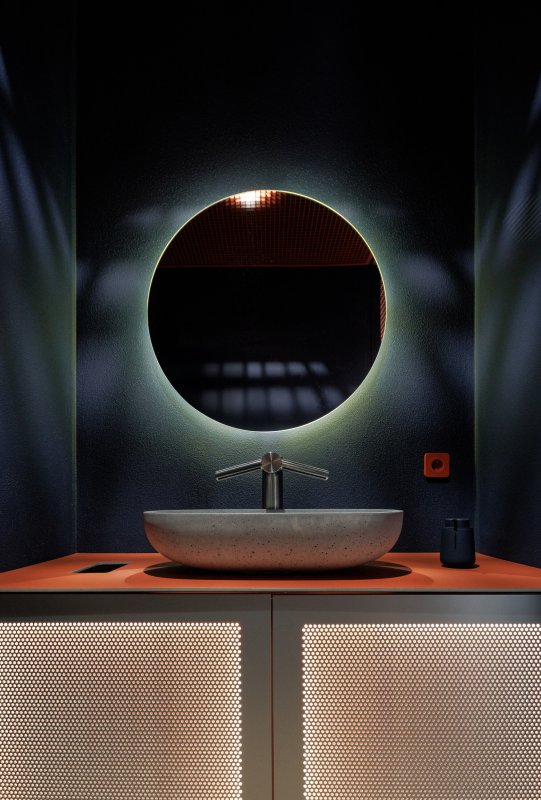 Materiály a farebnosť reflektujú estetiku letectva a hlbín oceánu: hliníkové a nerezové detaily, koralovo červená, evokujúca legendárna „Červeného baróna“, ikonického stíhacieho pilota, a atramentovo temná modrá kontrastujú s mäkkými, svetelnými barrisolovými podhľadmi a surovým betónom. Reflexné povrchy a scénografické nasvietenie priestorov opticky zväčšujú. Pôvodné piliere, porastené popínavými rastlinami, vnášajú do priestoru prvky zelene a dotvárajú tak harmonické prepojenie techniky a prírody.