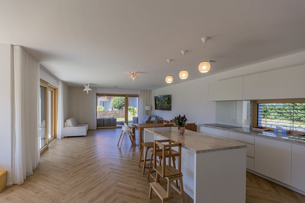 Na prízemí je hlavný obytný priestor s kuchyňou a jedálňou, potom pracovňa, kúpeľňa a technická miestnosť. V podkroví spálňa so šatňou a kúpeľňou, tri detské izby a druhá kúpeľňa. A v jednej z detských izieb sme spravili prípravu na vodu, aby sa napríklad za pár rokov dala premeniť na kuchyňu a poschodie mohlo fungovať ako samostatná bytová jednotka. Nechcem to privolávať, ale vzhľadom na stále rastúce ceny nehnuteľností a nedostatok pozemkov možno naše deti nebudú mať takú možnosť, ako sme mali my, takže sme od začiatku chceli zaistiť možnosť dvojgeneračného bývania.