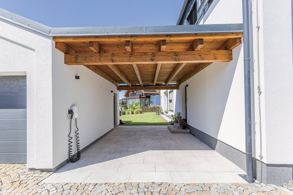 Moju ženu. Všetko pekné je dielom mojej ženy. Konštrukčne je presah riešený vymurovaním múrov a klasickým krovom, povrch je komplet riešený omietkou. Uvažovalo sa o drevenom podbití, ale hovoril som žene, že ho natierať nebudem (smiech). Vikiere v podkroví sú obložené hliníkovým plechom.