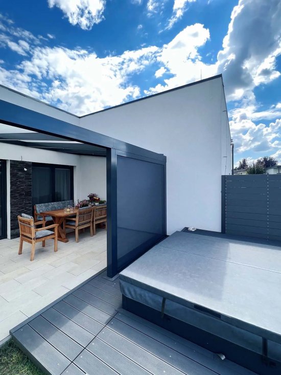Praktickou novinkou sú modulárne pergoly, ktoré je možné dopĺňať o bočné panely, osvetlenie, ohrievače alebo aj inteligentné ovládanie pomocou aplikácie. Výsledkom je priestor, ktorý funguje takmer ako vonkajšia izba, s komfortom vnútorného interiéru, ale s výhodami pobytu na čerstvom vzduchu.