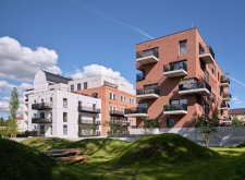 Dom uzatvárajúce námestie sme pojali ako trojpodlažnú stavbu so svetlou tehlou, bielymi kovovými prvkami a rovnou strechou. Zámerne sa odlišuje od historických budov – kontrastom podčiarkuje svoju modernosť. Miesto balkónov ponúka lodžie a terasy.