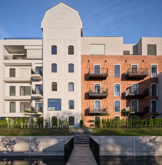 Druhá novostavba stojí pri náhone a rieke. Je to jednoduchý päťpodlažný kváder s fasádou z červenej režnej tehly, veľkými francúzskymi oknami a kombináciou lodžií a balkónov. Vzťahuje sa k rieke svojou pravidelnosťou a otvorenosťou.